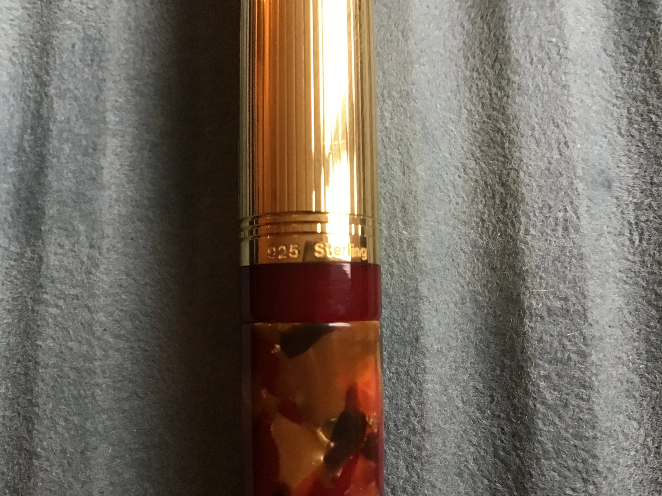 Design and Material: The pen features a terracotta-colored (red) barrel with a contrasting solid sterling silver cap (imprinted 925 Sterling) that has a gold (vermeil) finish.